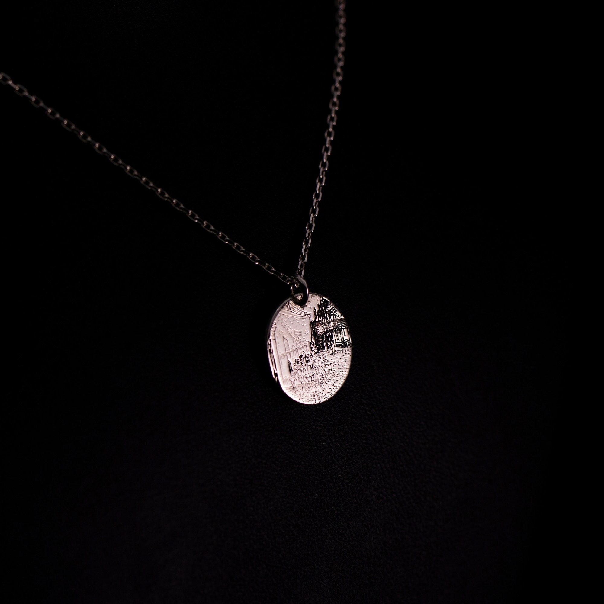 This personalized necklace features a beautiful pendant inspired by Vincent Van Gogh's famous painting "Cafe Terrace at Night". The pendant is made of high quality 925 silver and depicts the enchanting scene of a night cafe in Arles, France, with warm yellow lights and a starry sky.