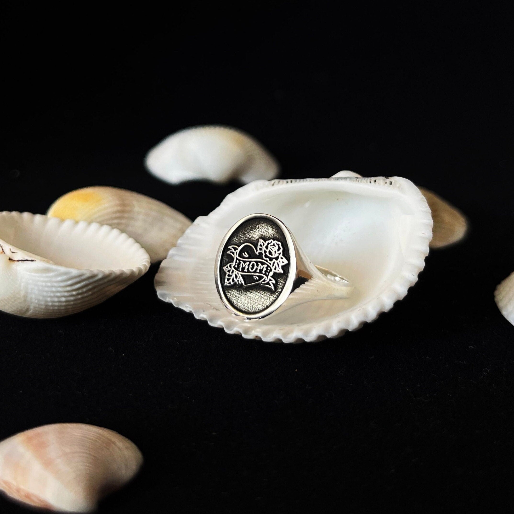 • This Inspired by american traditional tattoos, Mom Signet ring is stylish and pretty ideal for everyday use. Engraving details of 925k handmade silver ring are very detailed and eye-catching. The ring is coated with rodium to emphasize the details of engraving •