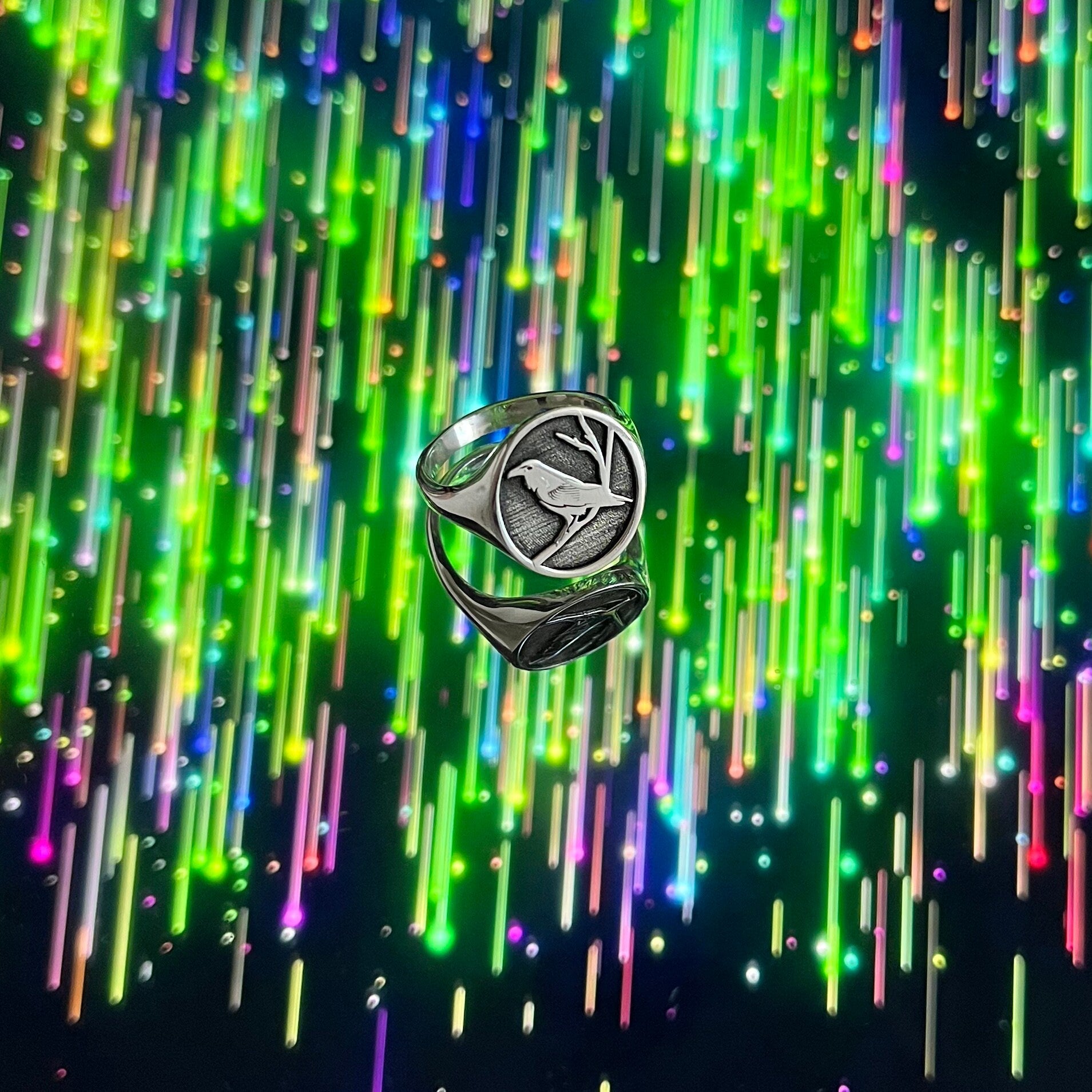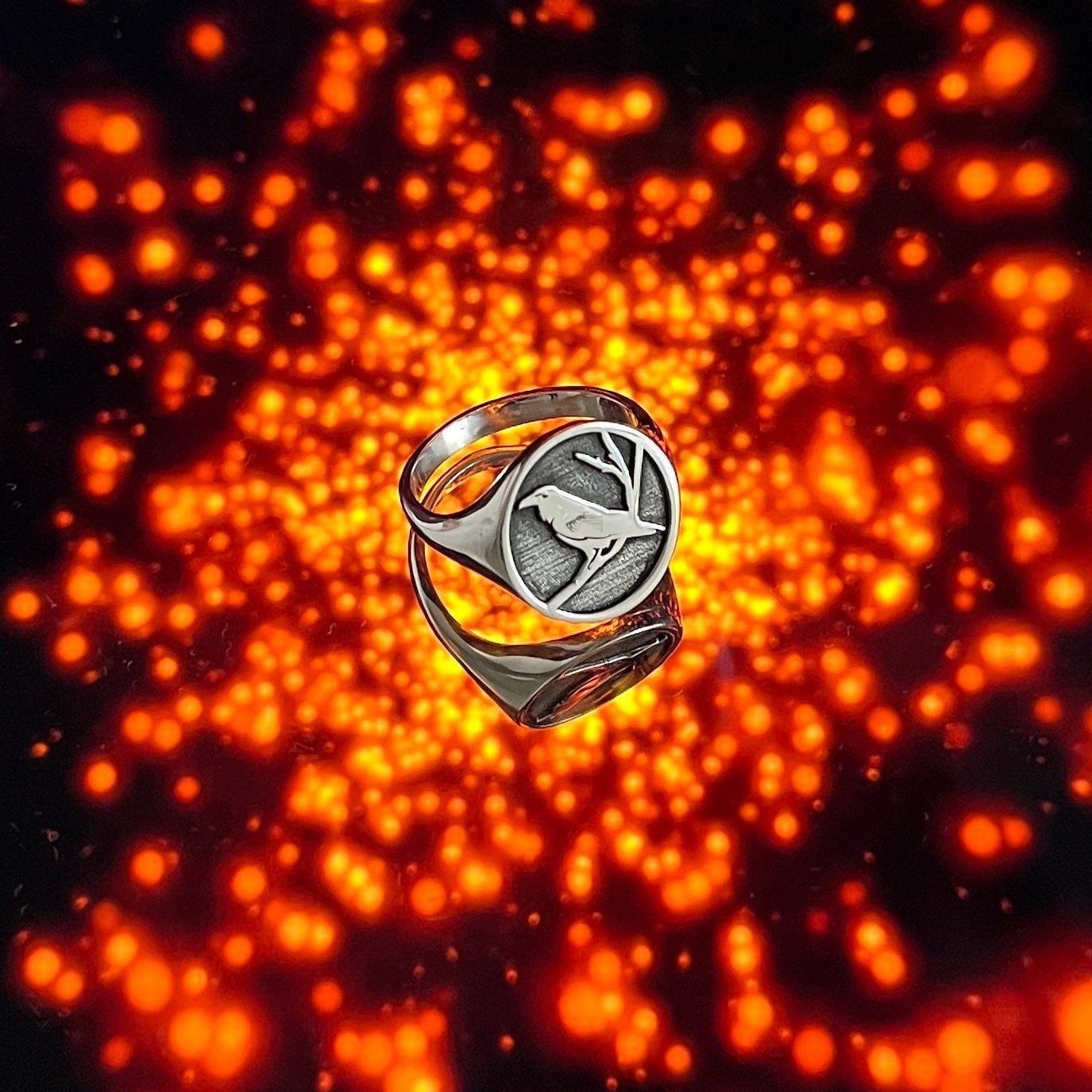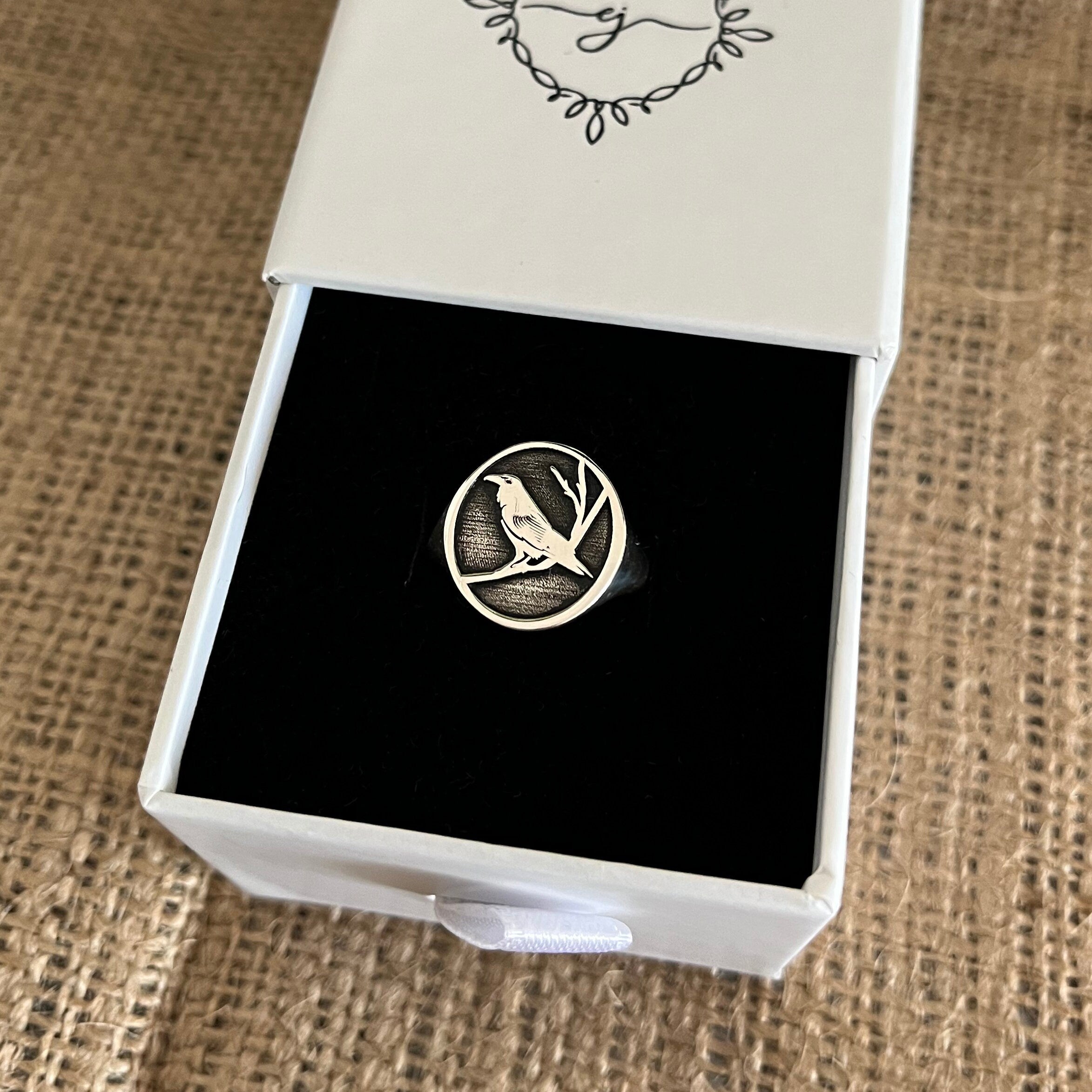 • This Inspired by american traditional tattoos, Raven Signet ring is stylish and pretty ideal for everyday use. Engraving details of 925k handmade silver ring are very detailed and eye-catching. The ring is coated with rodium to emphasize the details of engraving •