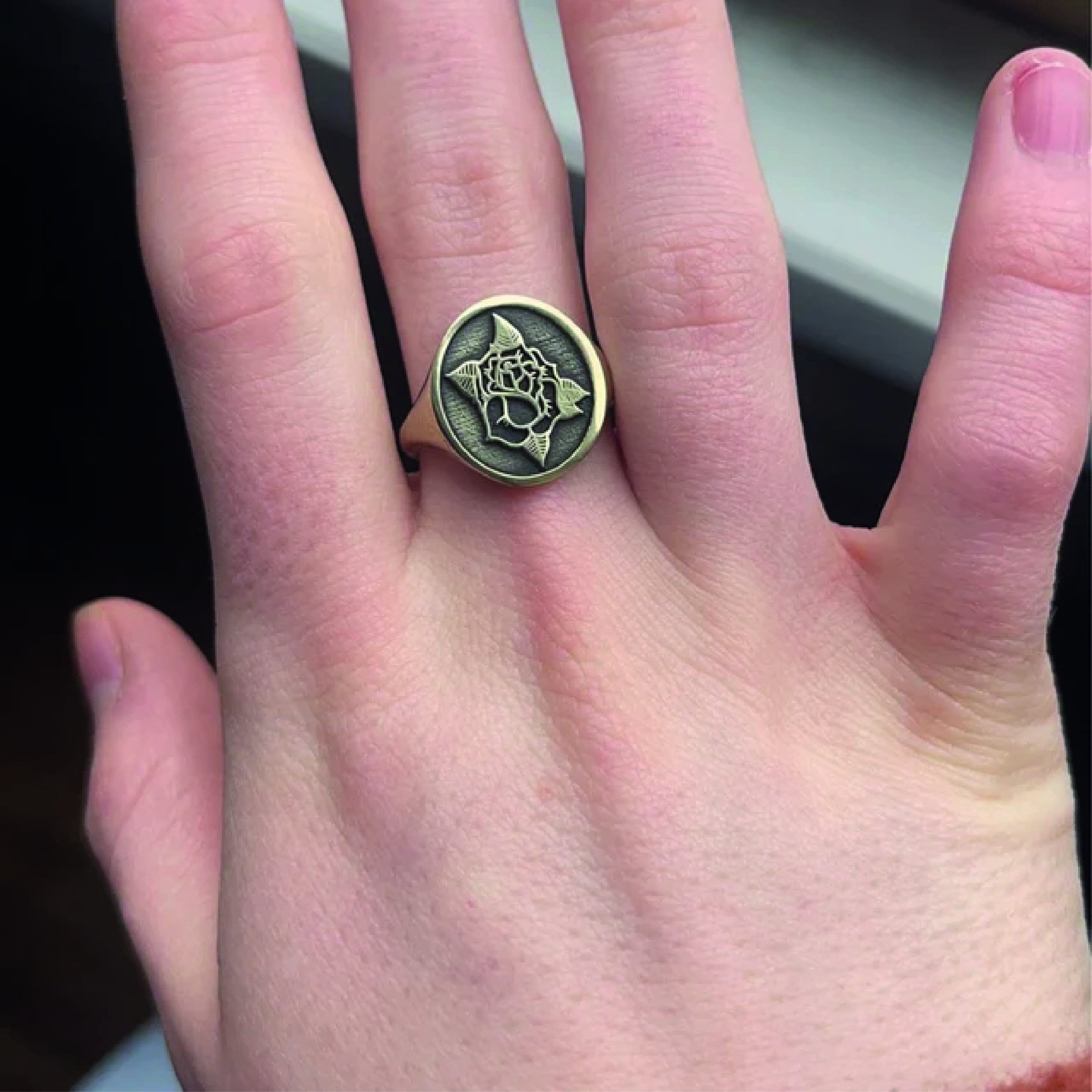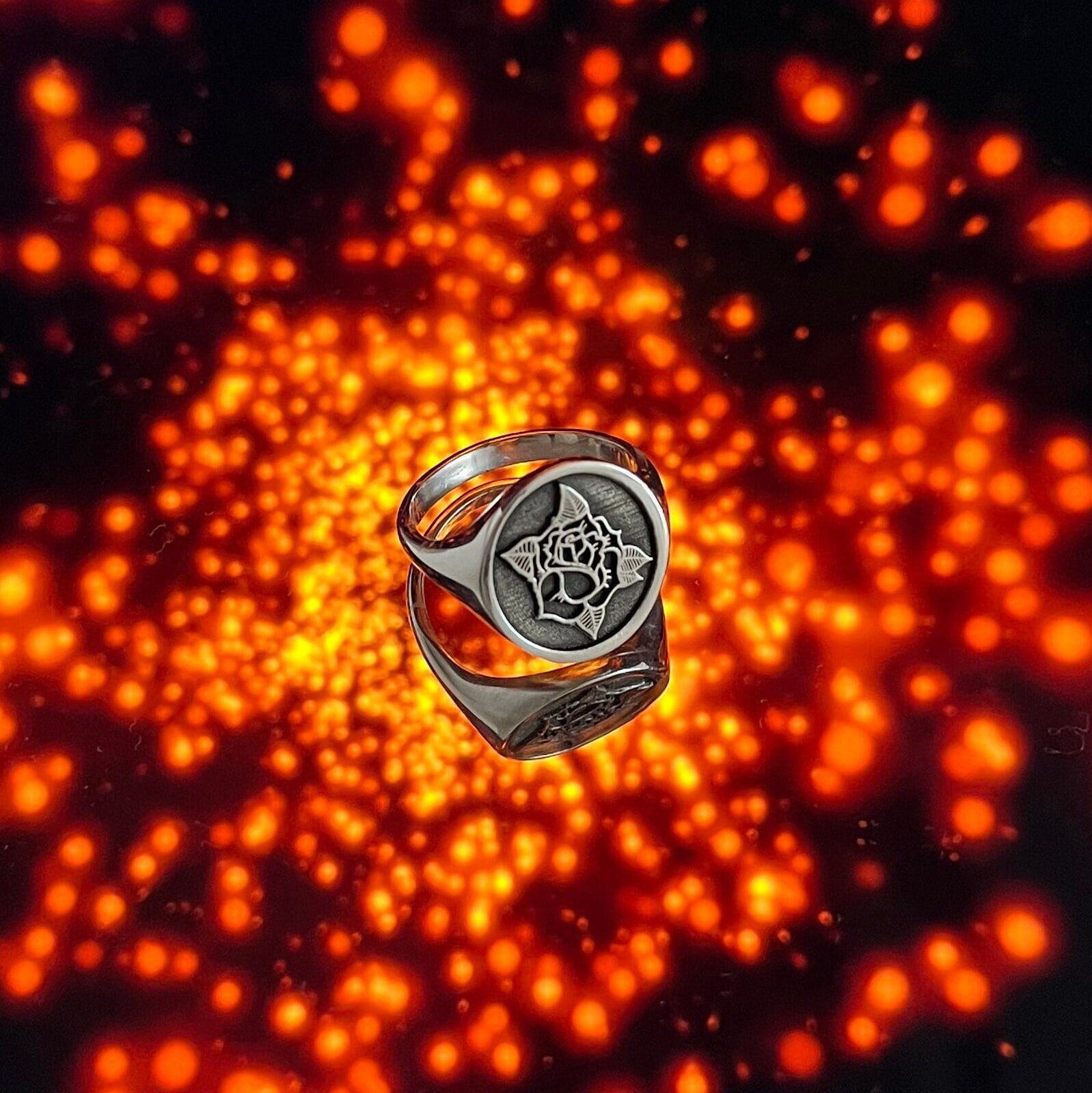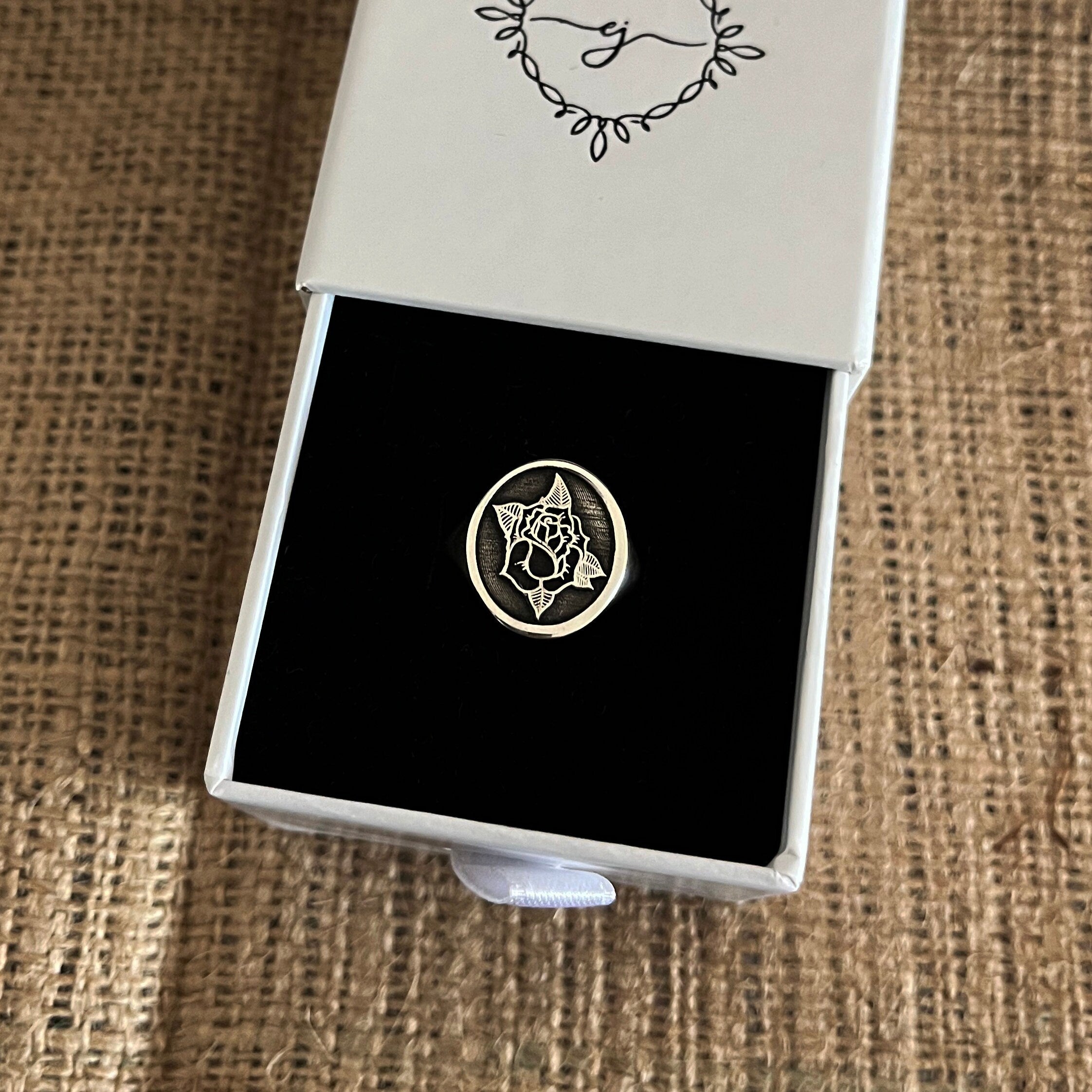 • This Inspired by american traditional tattoos, Rose Signet ring is stylish and pretty ideal for everyday use. Engraving details of 925k handmade silver ring are very detailed and eye-catching. The ring is coated with rodium to emphasize the details of engraving •