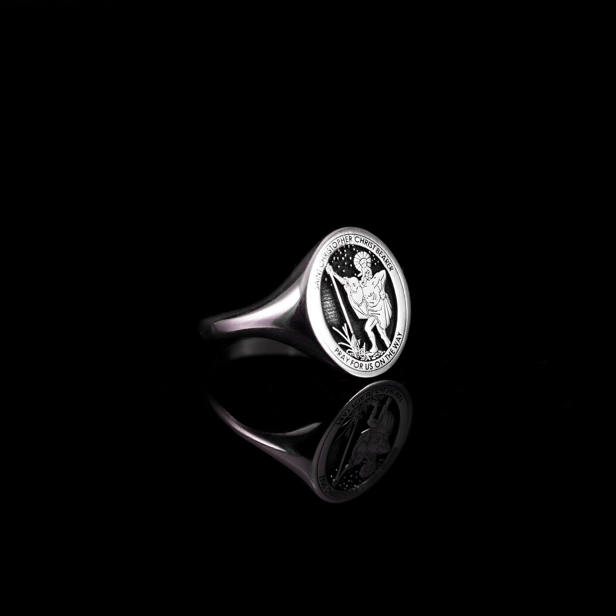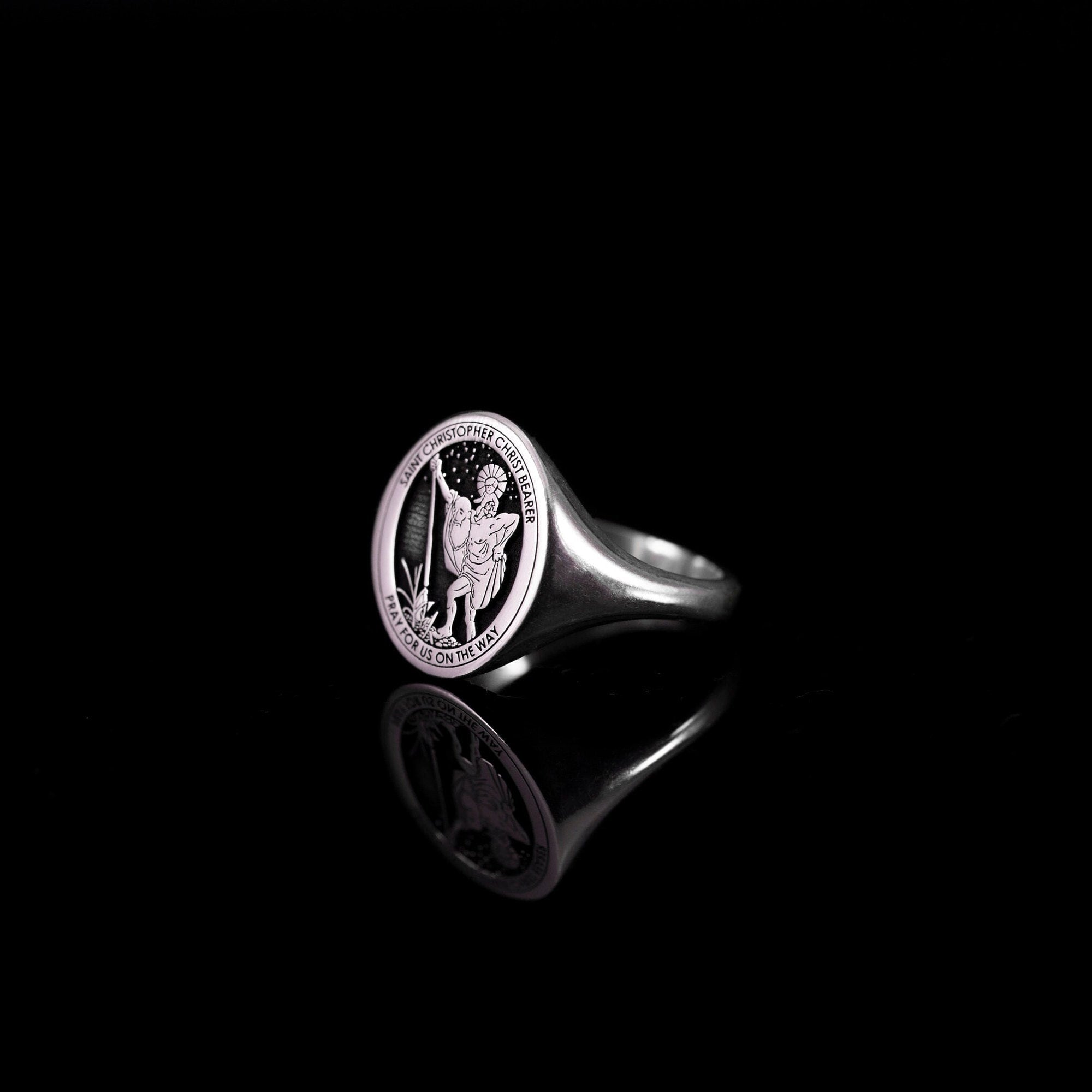 This unique Saint Christopher ring was designed as a Christian Saints seal ring and Catholic little finger ring for both men and women. This religious jewelry is the perfect choice to express both your religious belief and style.